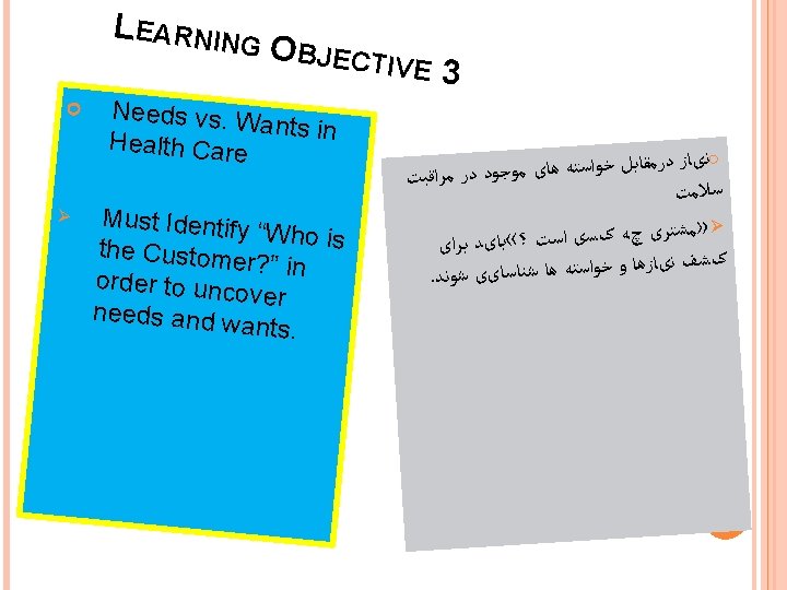 TIVE C E J B GO LEARNIN 3 Needs vs. Wants in Health Care ü ü Health care professional responsibility DEMANDS treatment of needs. Many consumers are seeking a professional response to wants. ﻧیﺎﺯ ﺩﺭ ﻣﻘﺎﺑﻞ ﺧﻮﺍﺳﺘﻪ ﺩﺭ ﻣﺮﺍﻗﺒﺖ ﺳﻼﻣﺖ Health care professional responsibility DEMANDS ü treatment of needs. ﺑﺴیﺎﺭی ﺍﺯ ﻣﺼﺮﻑ کﻨﻨﺪگﺎﻥ ﺑﻪ ﺩﻧﺒﺎﻝ پﺎﺳﺦ ﻫﺎی ﺣﺮﻓﻪ ﺍی ﺑﻪ ﺧﻮﺍﺳﺘﻪ ﻫﺎیﺸﺎﻥ ﻫﺴﺘﻨﺪ ü