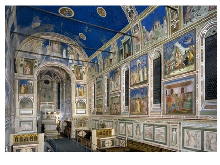 • La capilla de Scrovegni también conocida como capilla de la Arena, fue construida por Enrico Scrovegni como penitencia para expiar los pecados de su padre. La construcción de la capilla comenzó en 1303 y terminó en 1306. • Esta decoración mural de la capilla es una de las más importantes obras maestras de Giotto • En su interior hay frescos que cubren por entero la única nave de la capilla. , los frescos están dispuestos en tres bandas horizontales superpuestas, lo que hace un total de 36 cuadros. El orden narrativo es de izquierda a derecha y de arriba abajo. Algunas narraciones por ejemplo son la vida de San Joaquín y Santa Ana entre las demás narraciones de tema religioso •