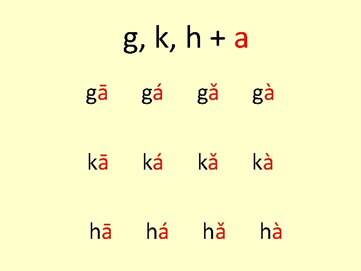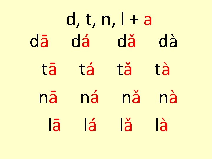 Tones and Tone Marks • • Different tones indicate different meanings For example: 1 st 2 nd 3 rd 4 th mā má mǎ mà mother hemp horse to scold Māmā mà mǎ Mother is scolding the horse. Mǎ mà māmā The horse is scolding mom. bā eight bá to pull out bǎ dā dá dǎ to build up to answer to hit bà dà big