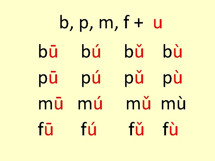 b, p, m, f + o bō bó bǒ bò wave uncle lame thumb pō pó pǒ pò mō mó mǒ mò fō fó fǒ fò