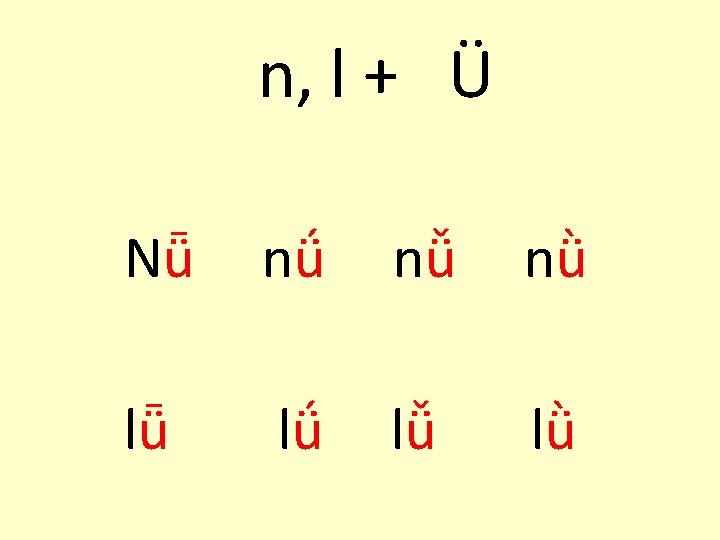 Finals • Finals: • Simple finals: a, o, e, I, u, ü • Compound finals: main vowel + secondary vowel • Nasal finals: finals ending with n and ng