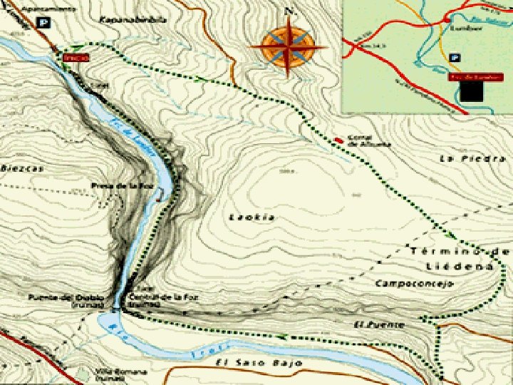 *CAMINO DE LOS PUENTES (S. L. NA-112). Longitud: 2, 2 km. El sendero se inicia en el puente de Sielva, cuya estructura es de origen medieval. Por el camino del Iturbero, de reciente construcción se llegará hasta las puertas del camping homónimo. A continuación se toma una senda por el borde del río Salazar que permite contemplar el emplazamiento defensivo de Lumbier, antaño amurallado. Se cruzará el río por el puente de las Cabras, así denominado por ser el paso obligado del ganado. 3ª ruta Plano del Camino de Los Puentes Este puente fue, probablemente, paso jacobeo antes de que el camino de Liédena se convirtiera en principal en el siglo XVI. Ya en el casco urbano, se puede admirar un lienzo de la antigua muralla y los diversos edificios de su calle mayor, entre los que destacan el Ayuntamiento, la iglesia o el palacio de Jauregizar, de estilo barroco, además de casas blasonadas, portaladas medievales. . . y el centro carlista, recuerdo vivo del partido político más antiguo de Navarra. Al final de la calle mayor, una estrecha carretera