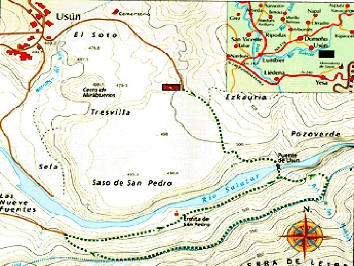 *RUTA DE LA CANALETA (S. L. NA-110). Longitud: 3, 2 km. En Usún (Romanzado). Desde el aparcamiento del Saso de San Pedro, se toma el viejo camino que conduce al puente de Usún. Cruzado el río Salazar, arquitecto de la Foz, otra senda les llevará a la llamada canaleta, conducción de agua de boca a la cercana Lumbier construida en 1928, importante obra de ingeniería para su época en un marco paisajístico de especial belleza. 2ª ruta Plano de la Ruta de la Canaleta Se sigue la canaleta, con un trazado casi llano, hasta abandonarla por una senda descendente que les llevará al viejo camino entre Lumbier y Usún. Este camino pasa por la ermita de San Pedro, cuyo crismón del siglo XII es uno de los vestigios de un antiguo monasterio, el primero documentado en Navarra. El sendero desemboca en el puente de Usún, desde donde se llegará al punto de partida por el camino del comienzo.