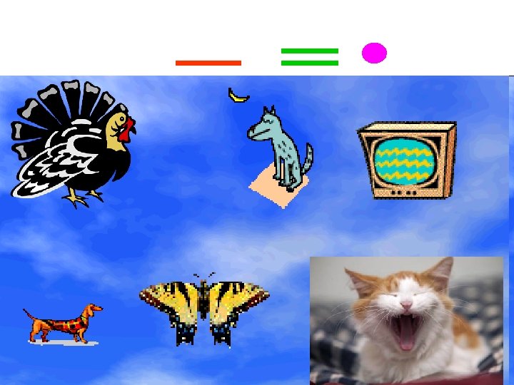 Sakiniai Kalakutas pyksta. Vilkas staugia. Televizorius mirguliuoja. Šuo bėgioja. Drugelis skrenda. Katė žiovauja.