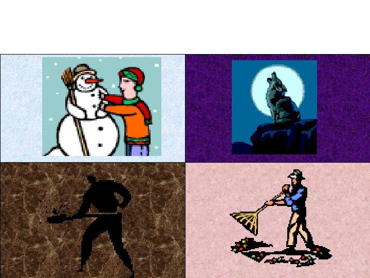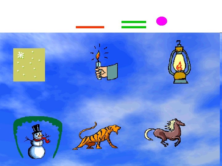 Sakiniai Snaigės krenta. Žvakė dega. Žibintas šviečia. Besmegenis šypsosi. Tigras riaumoja. Arklys šuoliuoja.