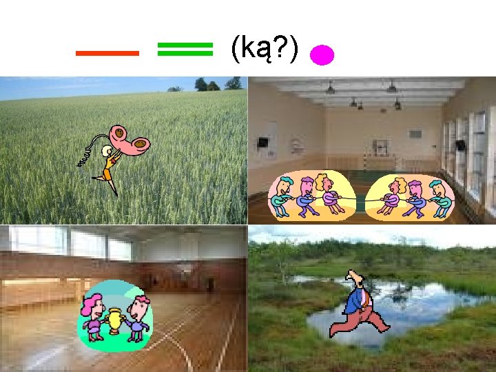 Sakiniai Rita neša telefono ragelį. Komandos traukia virvę. Sportininkai laimėjo taurę. Vyras vejasi varlę.
