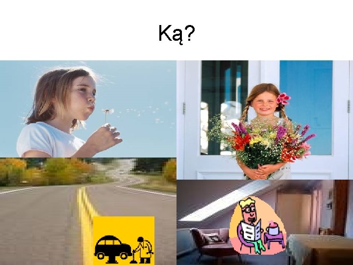 Sakiniai Mašina važiuoja keliu. Popierių kerpa žirklėmis. Narsuolis plaukia banglente. Mašina rieda kalnais.