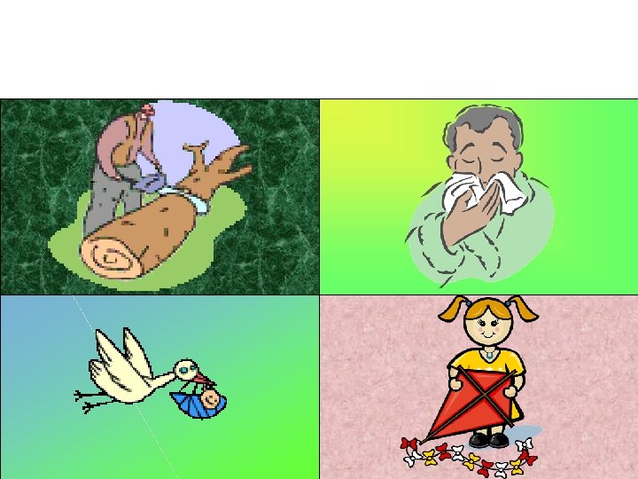 Sakiniai Medkirtys kerta mišką. Ligonis turi nosinę. Gandras neša vaiką. Virgutė leidžia aitvarą.