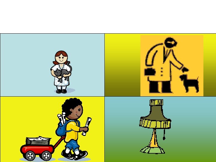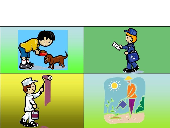 Sakiniai Juozukas šukuoja šunį. Laiškininkas neša laišką. Dažytojas dažo sieną. Sodininkas laisto medelį.