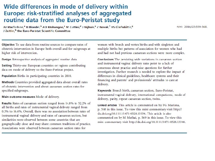 údaj o počtu CS je mylně používán jako primární indikátor kvality poskytované zdravotní péče tzv. spolehlivé ukazatele porodnické morbidity: - postpartální haemorrhagie (PPH) - peripartální infekce - poranění perinea - neonatální morbidita - tromboembolismus mají omezenou výpovědní hodnotu jako indikátory kvality i za optimálních podmínek sběru dat Bailit J et al. AJOG 2013 209: 446. e 1 -30