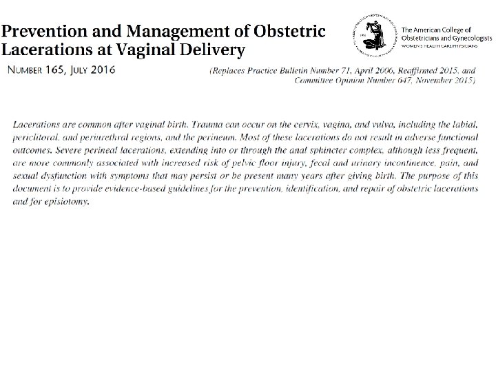 Limitations of Perineal Lacerations as an Obstetric Quality Measure. Committee on Obstetric Practice. Perineal lacerations are a common occurrence with vaginal delivery. Although perineal lacerations are tracked easily from coding data, there a variety of problems with using rates of such tears as a quality measure. The rate of severe perineal lacerations should not be used as a measure of obstetric quality for the following three reasons: 1) third-degree and fourth-degree perineal lacerations may not be defined uniformly; 2) severe perineal lacerations are associated strongly with nonmodifiable risk factors; and 3) diminishing the use of operative vaginal delivery, in an effort to decrease severe perineal lacerations, likely would result in an increased rate of cesarean delivery. Measuring the rate of episiotomy with unassisted vaginal deliveries is an alternative candidate for quality measurement, but it requires validation before widespread implementation.