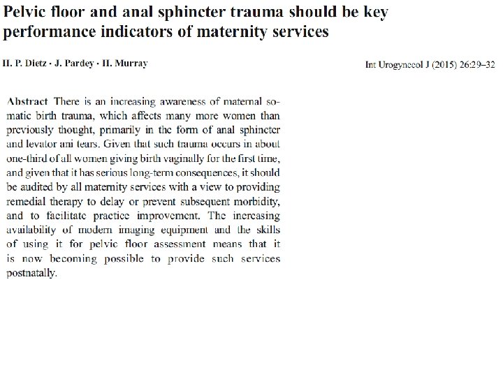 Avulze = pojítko mezi vaginálním porodem a dysfunkcí pánevního dna 3 D UZ MLA trauma vykazuje významnou asociaci se symptomatickým sestupem Dietz HP et al. BJOG 2008 115: 979 -984, Delancey JO at al. Ob Gyn 2007 109: 295 -302 MRI MLA trauma vykazuje významnou asociaci s recidivou cystokély po klasickém rekonstrukčním výkonu Dietz HP et al. UOG 2010 36: 76 -80, age 35 years 4 months after delivery, (birth weight 2700 g)