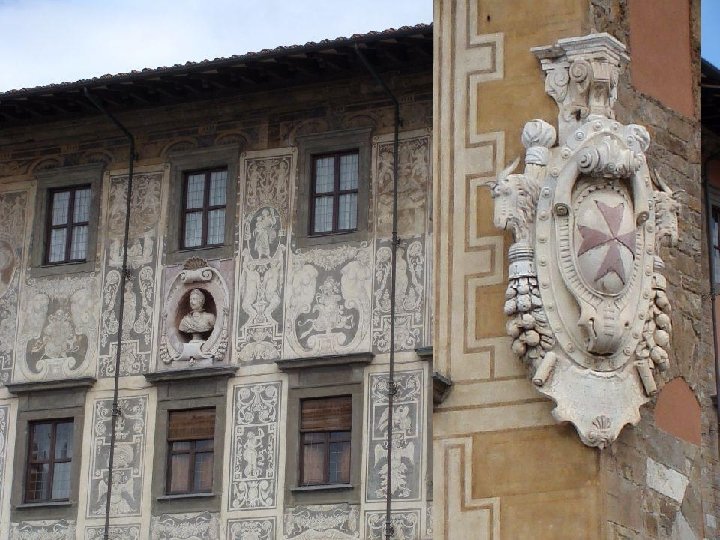 The façade was decorated with frescoes by Giovanni Stefano Maruscelli and Filippo and Lorenzo Paladini. The cycle of frescoes celebrated the Medici's good government with the allegories of Peace, Earth, Abundance, Intelligence, Glory and Nations. Most frescoes have been lost. It is the library of the Scuola Normale Superiore, but it is interesting especially because it was built connecting two medieval towers, Torre della Giustizia and Torre dei Gualandi.