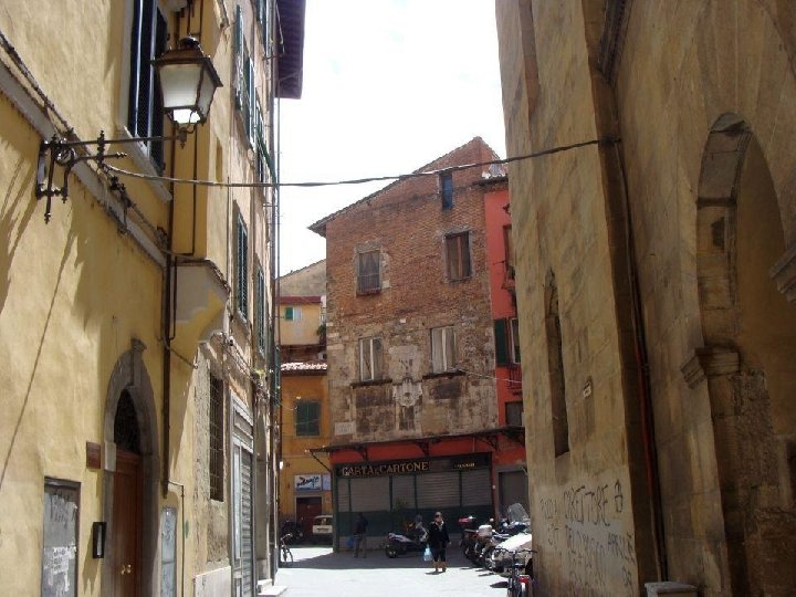 Torre dei Gualandi, on the right, is also know as Torre della fame ("Tower of hunger") or Tower of Count Ugolino della Gherardesca. The legend says that he was left to starve here with his children, whom he ate, as recounted in Dante's Divine Comedy. The building was built by the Vasari as hospital
