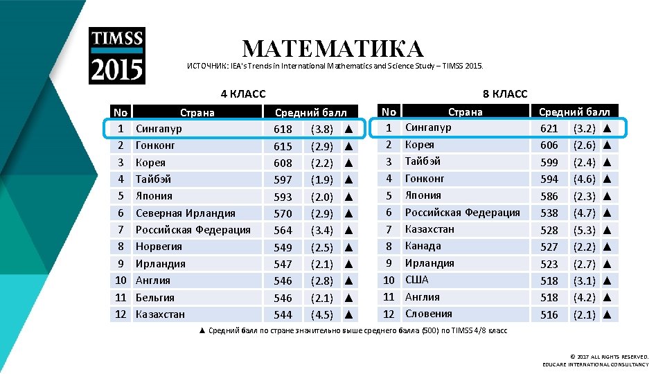 СИНГАПУРСКИЕ ОБУЧАЮЩИЕСЯ В TIMSS (МАТЕМАТИКА) 643 59 587 567 606 611 583 590 625 618 621 590 597 621 618 611 606 605 599 1995 594 593 2007 TIMSS - Математика, 4 класс 2011 2015 TIMSS - Математика, 8 класс © 2017 ALL RIGHTS RESERVED. EDUCARE INTERNATIONAL CONSULTANCY