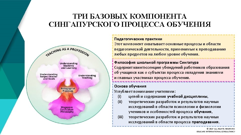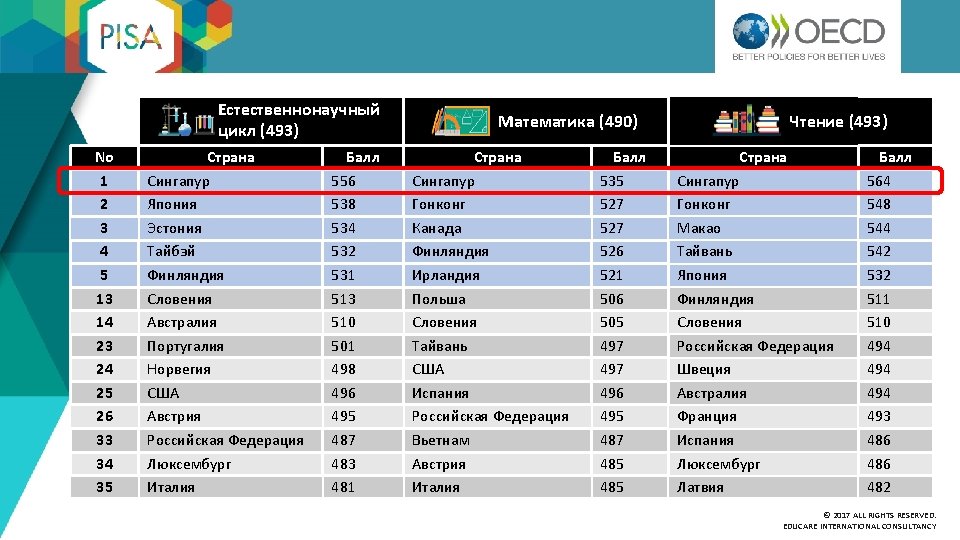 СИНГАПУРСКИЕ ОБУЧАЮЩИХСЯ В PISA 573 564 562 551 542 556 542 535 526 2009 PISA - Математика 2012 PISA - Естественнонаучный цикл 2015 PISA - Чтение © 2017 ALL RIGHTS RESERVED. EDUCARE INTERNATIONAL CONSULTANCY