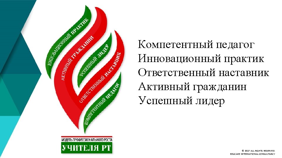 е e E ски th ica й П l E ед du аг ca ог to r Фи ло со фи я ипы инц es Пр incipl Pr МОДЕЛЬ РАЗВИТИЯ УЧИТЕЛЯ Эт ич Th Действия Practice © 2017 ALL RIGHTS RESERVED. EDUCARE INTERNATIONAL CONSULTANCY