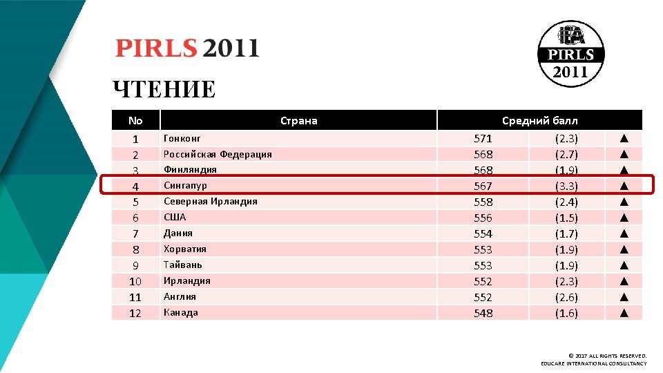 СИНГАПУРСКИЕ ОБУЧАЮЩИЕСЯ В PIRLS 567 528 558 567 528 2001 2006 2011 © 2017 ALL RIGHTS RESERVED. EDUCARE INTERNATIONAL CONSULTANCY