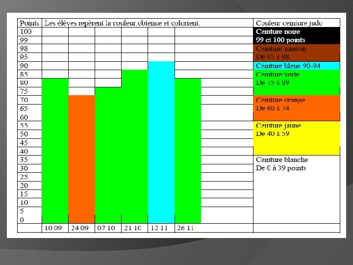 Les différents types de dictée Dictée judo : � La dictée judo est un texte, étalonné sur 100 points, dicté aux élèves. Chaque mot correctement orthographié rapporte des points (barème élaboré par l’enseignant. Par exemple, les petits mots : 1 point, les noms et les adjectifs : 2 points, les verbes : 3 points). Le score réussi par chaque joueur est référé à un code de couleur qui rappelle celles des ceintures des judokas.