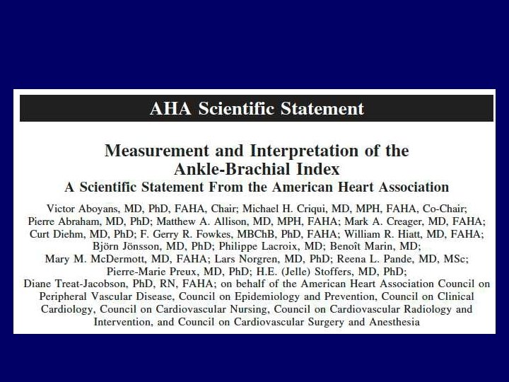 Take Home Message 1. Traditional ABI (using higher values of PT/DP) if utilizing for diagnosis 2. Alternative ABI (using lower value of PT/DP) if utilizing for treatment 3. Exercise ABI for diagnosis of proximal stenosis/external iliac Endofibrosis 4. ABI with exercise for popliteal artery entrapment and cystic adventitial disease (30% reduction in ABI post-exercise) 5. Highlight need for non-invasive lab to report all measured indices 6. Our current practice at Tulane University Medical Center: Right ABI—PT index with PSP, DP index with PSP Left ABI—PT index with PSP, DP index with PSP 7. If normal, exercise ABI