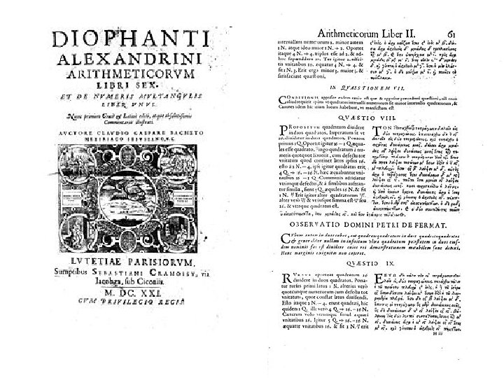 Cubum autem in duos cubos, aut quadrato-quadratum in duos quadrato-quadratos, et generaliter nullam in infinitum ultra quadratum potestatem in duos eiusdem nominis fas est dividere cuius rei demonstrationem mirabilem sane detexi. Hanc marginis ` exigitas non capere. Es imposible para un cubo escribirse como suma de dos cubos, o para una potencia cuarta escribirse como suma de dos potencias cuartas, o en general, para cualquier número igual a una potencia superior a dos escribirse como la suma de dos potencias iguales. Tengo una prueba maravillosa de este hecho pero no cabe en este margen estrecho. Pierre de Fermat, ~1937
