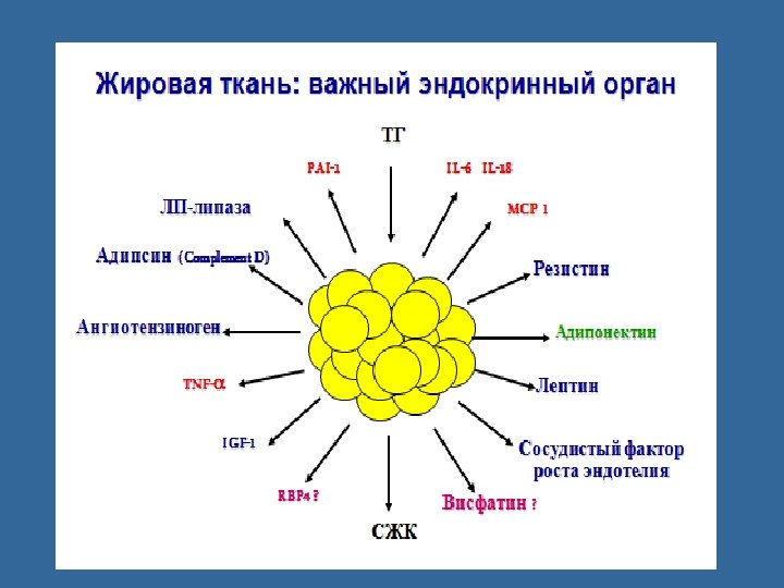 • Piy toxuması orqanizmin enerji ehtiyatının əsas “ambarı”dır. Qida ilə orqanizmə daxil olan enerjinin 75 %- maddələr mübadiləsinə sərf olur, 10 -15%-i müxtəlif fiziki aktivlik zamanı istifadə olunur, 10 -15 % termogenezinə sərf olunur. • Son illərin tədqiqatlarına görə, piy toxuması 100 dən cox hormon ifraz edir, bunlar- leptin, rezistin, şişlərin nekrozu amili (bet ŞNF), adiponektin, visfаtin, qrelin, lipoprotein lipazası, endoteli faktoru (VEÇF), interleykin-6, angiotenzinogen, və s. hormonlar və biloloji aktiv maddələr ifraz edır, ona görə pıy toxuması-endokrın vəzı sayilır. • Abdominal-visseral piylənmə insulinə rezistentliklə əlaqədardır. Artıq bədən çəkisi insulınrezıstentlıı ılə korrelyasiya edır.