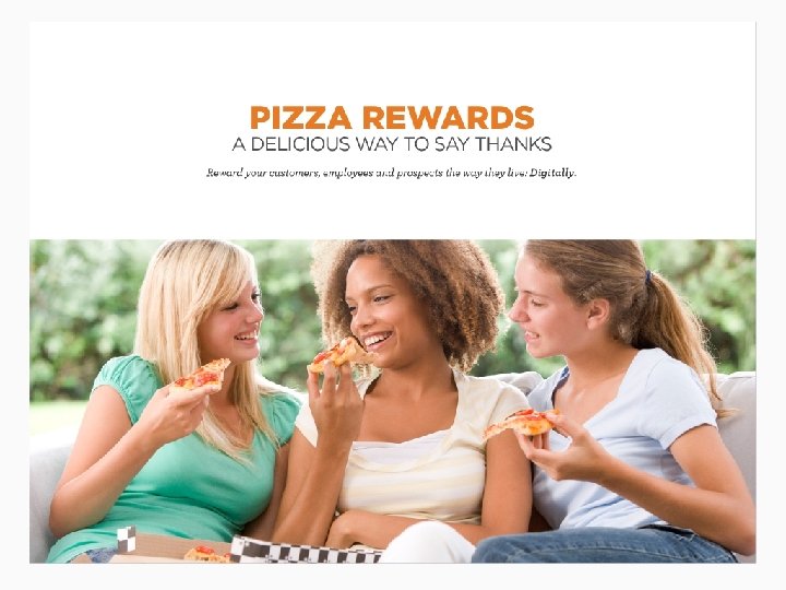 Pizza Rewards Slice into success by rewarding customers with America's favorite food. Pizza! As customizable as a pizza pie itself, Pizza Rewards are a delicious way to build brand awareness and loyalty. This reward provides customers with a complimentary pizza at a major pizza chain. So whether it's used for a plain pie or slices with the works, your customers will have your brand to thank. • Pizza is a reward that has high value, with consumers spending nearly $32 billion on pizza each year. • Available at more than 50, 000 restaurant locations. • May be redeemed for any food or beverage Digital Rewards Online Power, Real-World Reach