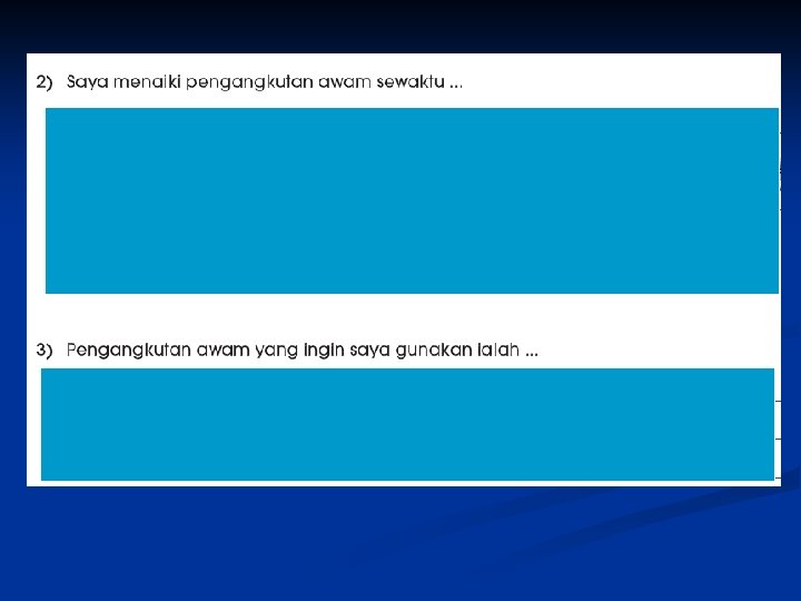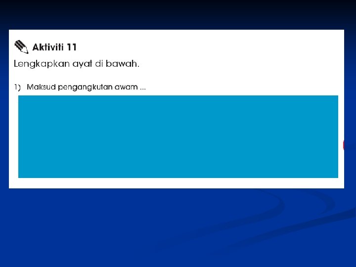 Sistem Bahasa : • • • Tatabahasa – kata nama am Kosa kata : pengangkutan awam monorel komuter Pengisian Kurikulum : Ilmu – Nilai – KBT – TKP Kemahiran Hidup Bersyukur, bertolak ansur Banding beza : Interpesonal Media Pengajaran : Media 6. 1 Grafik tulang ikan( jenis-jenis pengangkutan awam Media 6. 2 Kad imbasan gambar dan perkataan pengangkutan awam di Malaysia. Buku Aktiviti : Aktiviti 11 Refleksi : (Berdasarkan penilaian guru selepas pengajaran dan pembelajaran dilaksanakan) Menyenaraikan peraturan dalam pengangkutan awam dan akibat jika tidak dipatuhi.