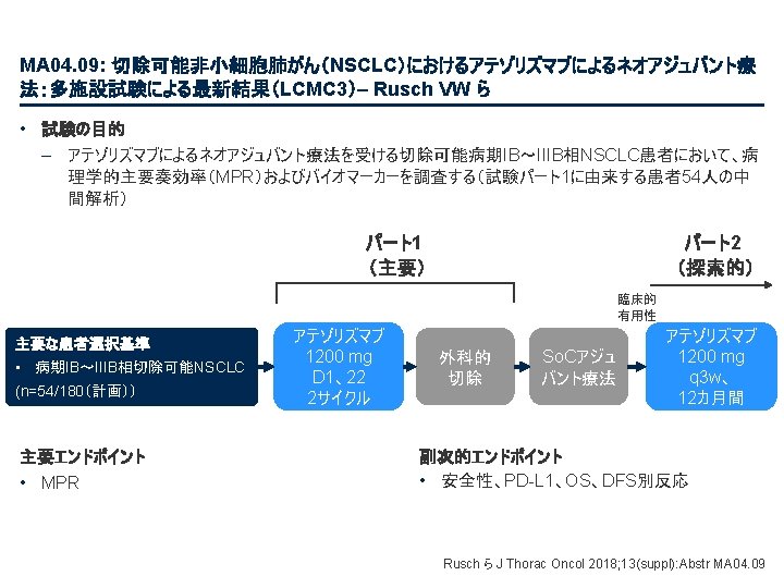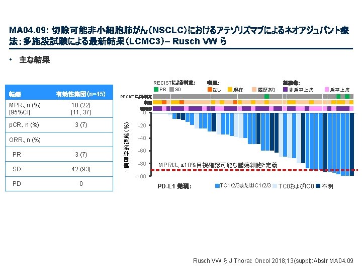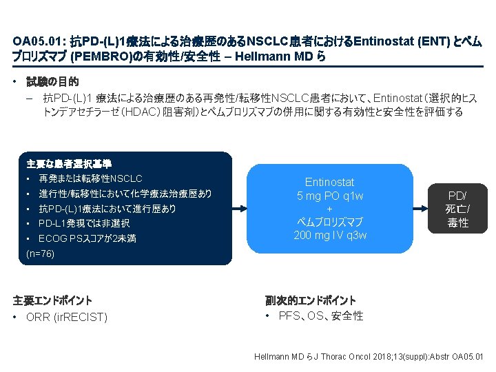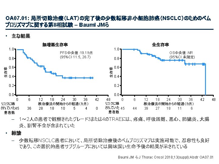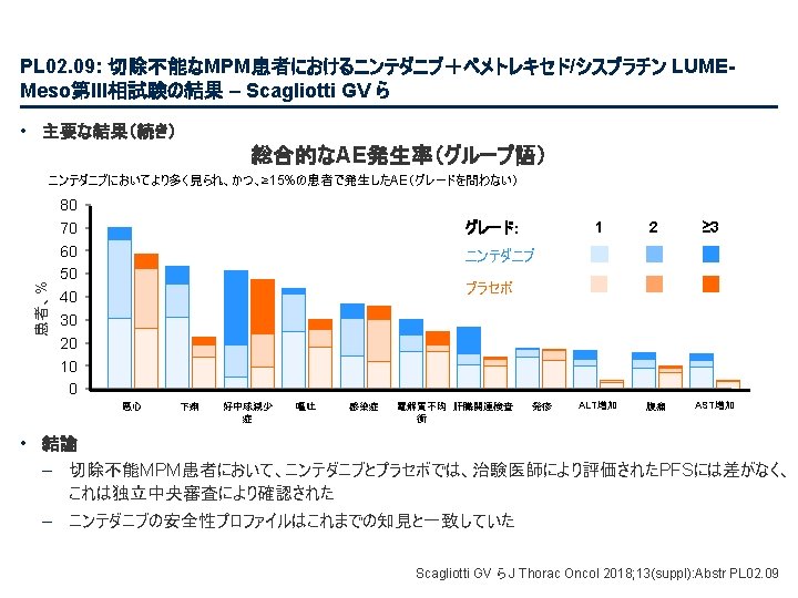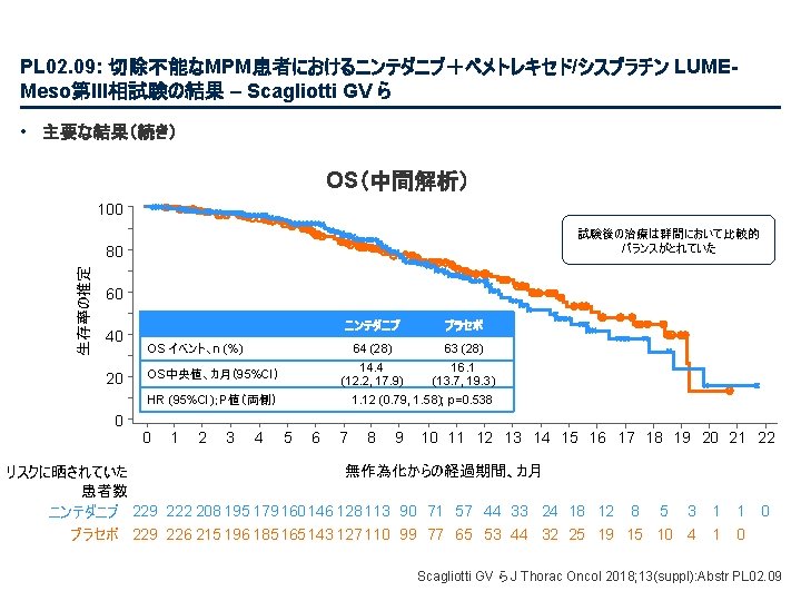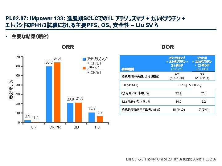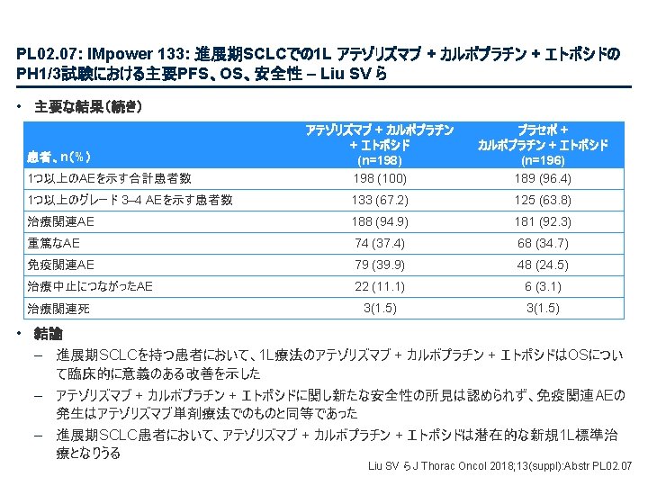 PL 02. 07: IMpower 133: 進展期SCLCでの 1 L アテゾリズマブ + カルボプラチン + エトポシドの PH 1/3試験における主要PFS、OS、安全性 – Liu SV ら • 主な結果 OS OS イベント、n (%) 100 OS中央値、カ月(95%CI) アテゾリズマブ + CP/ET (n=201) 104 (51. 7) プラセボ + CP/ET (n=202) 134 (66. 3) 12. 3 (10. 8, 15. 9) 10. 3 (9. 3, 11. 3) HR (95%CI) 0. 70 (0. 54, 0. 91); p=0. 0069 13. 9 追跡調査期間の中央値、カ月間 80 全生存率、% 12カ月OS 60 51. 7% 40 38. 2% 20 + アテゾリズマブ + CP/ET プラセボ + CP/ET 打ち切り時点 0 0 2 4 6 8 10 リスクに晒されてい た患者数 201 191 187 182 180 174 159 142 130 121 108 アテゾリズマブ 202 194 189 186 183 171 160 146 131 114 96 プラセボ 12 14 16 18 20 22 24 カ月 92 74 81 59 58 36 From NEJM, Horn L, et al. , First-line atezolizumab plus chemotherapy in extensive-stage small-cell lung cancer, DOI: 10. 1056/NEJMoa 1809064. Copyright © (2018) Massachusetts Medical Society. Reprinted with permission from Massachusetts Medical Society. 46 27 33 21 21 13 11 8 5 3 3 3 2 2 1 2 Liu SV ら J Thorac Oncol 2018; 13(suppl): Abstr PL 02. 07