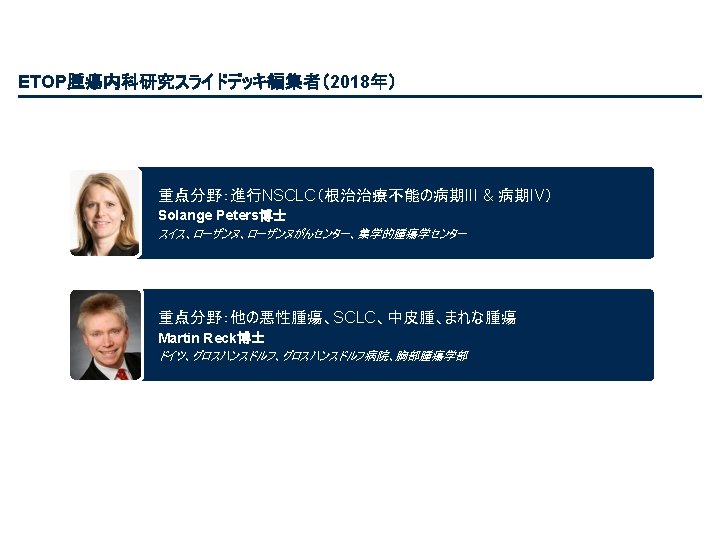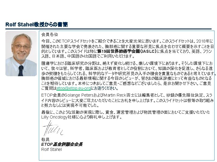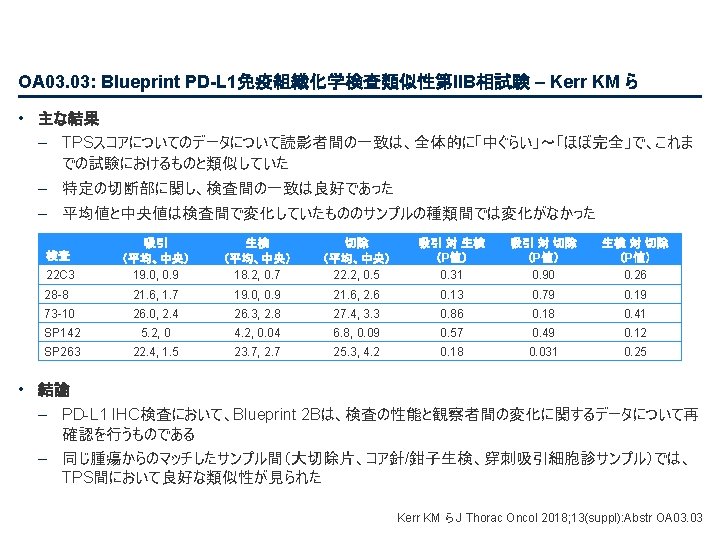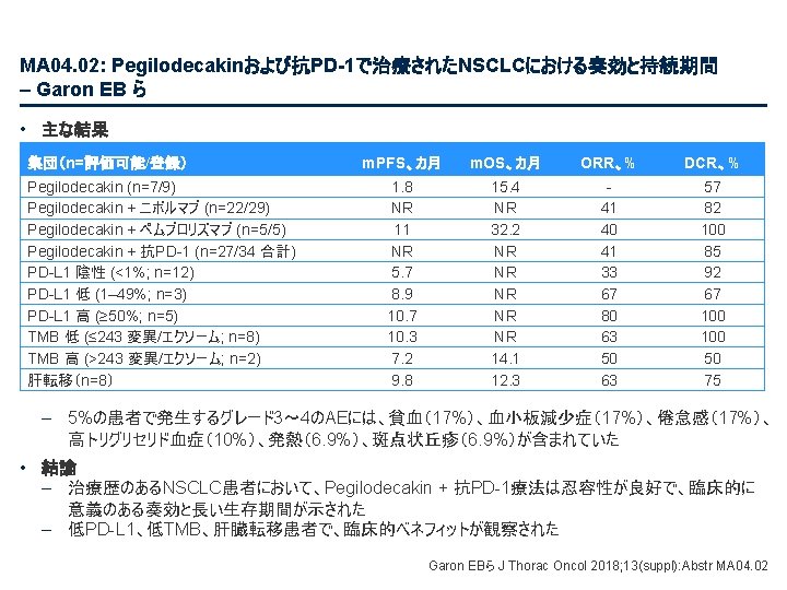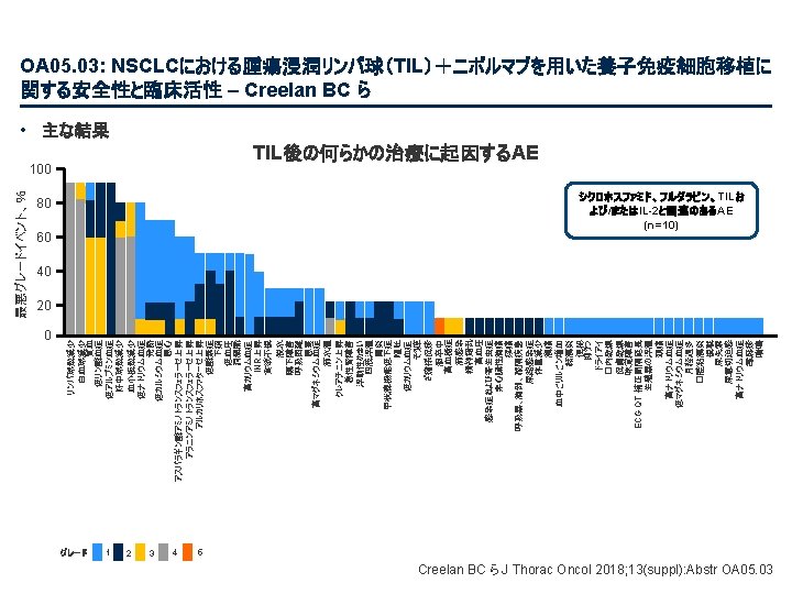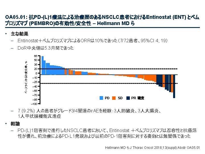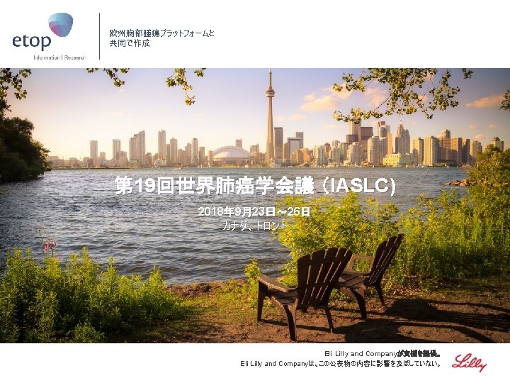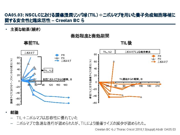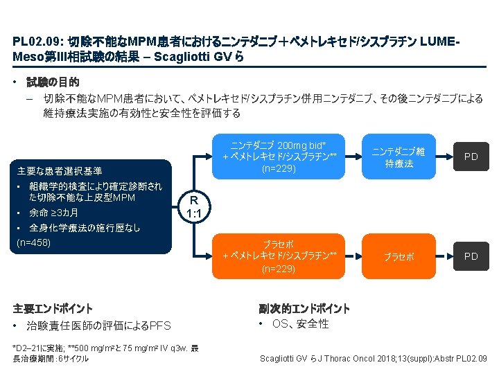 PL 02. 07: IMpower 133: 進展期SCLCでの 1 L アテゾリズマブ + カルボプラチン + エトポシドの PH 1/3試験における主要PFS、OS、安全性 – Liu SV ら • 主な結果 OS OS イベント、n (%) 100 OS中央値、カ月(95%CI) アテゾリズマブ + CP/ET (n=201) 104 (51. 7) プラセボ + CP/ET (n=202) 134 (66. 3) 12. 3 (10. 8, 15. 9) 10. 3 (9. 3, 11. 3) HR (95%CI) 0. 70 (0. 54, 0. 91); p=0. 0069 13. 9 追跡調査期間の中央値、カ月間 80 全生存率、% 12カ月OS 60 51. 7% 40 38. 2% 20 + アテゾリズマブ + CP/ET プラセボ + CP/ET 打ち切り時点 0 0 2 4 6 8 10 リスクに晒されてい た患者数 201 191 187 182 180 174 159 142 130 121 108 アテゾリズマブ 202 194 189 186 183 171 160 146 131 114 96 プラセボ 12 14 16 18 20 22 24 カ月 92 74 81 59 58 36 From NEJM, Horn L, et al. , First-line atezolizumab plus chemotherapy in extensive-stage small-cell lung cancer, DOI: 10. 1056/NEJMoa 1809064. Copyright © (2018) Massachusetts Medical Society. Reprinted with permission from Massachusetts Medical Society. 46 27 33 21 21 13 11 8 5 3 3 3 2 2 1 2 Liu SV ら J Thorac Oncol 2018; 13(suppl): Abstr PL 02. 07