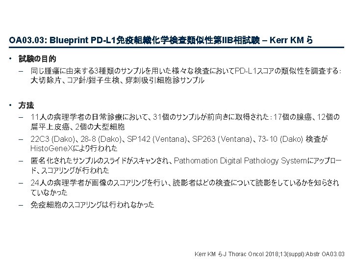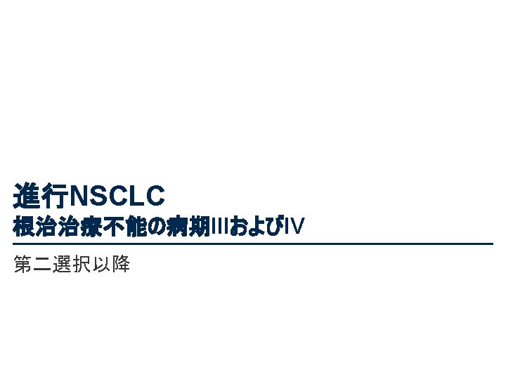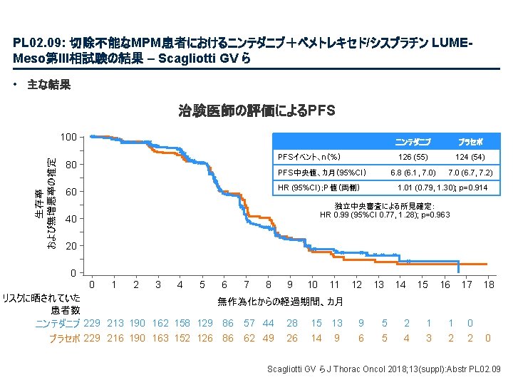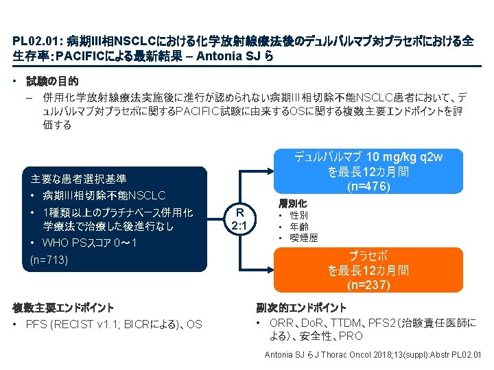 PL 02. 01: 病期III相NSCLCにおける化学放射線療法後のデュルバルマブ対プラセボにおける全 生存率:PACIFICによる最新結果 – Antonia SJ ら • 主要な結果(続き) BICRによるPFS最新情報(ITT) 1. 0 PFS率 0. 8 イベント数/ 患者数(%) PFS中央値、カ月( 95%CI) デュルバルマブ 243/476 (51. 1) 17. 2 (13. 1, 23. 9) プラセボ 173/237 (73. 0) 5. 6 (4. 6, 7. 7) HR 0. 51 (95%CI 0. 41, 0. 63) 55. 7% 49. 5% 0. 6 0. 4 34. 4% 0. 2 26. 7% 0. 0 0 リスクに晒されていた 患者数 デュルバルマブ プラセボ 3 6 9 12 15 18 21 24 27 30 33 36 39 83 24 43 10 23 5 1 0 0 0 無作為化からの経過期間、カ月 476 237 377 163 302 106 268 86 213 67 188 55 163 46 From NEJM, Antonia SJ, et al. , Overall survival with durvalumab after chemoradiotherapy in stage III NSCLC, DOI: 10. 1056/NEJMoa 1809697. Copyright © (2018) Massachusetts Medical Society. Reprinted with permission from Massachusetts Medical Society. 143 39 116 32 Antonia SJ ら J Thorac Oncol 2018; 13(suppl): Abstr PL 02. 01