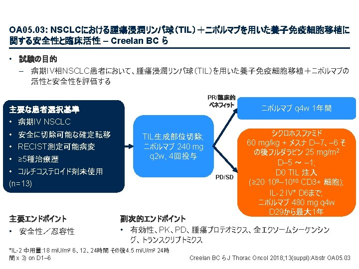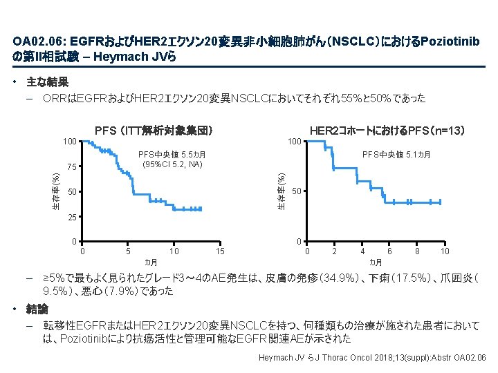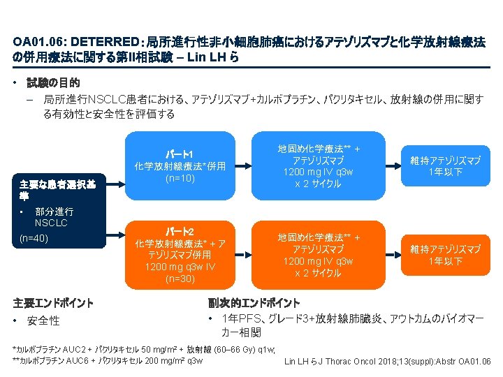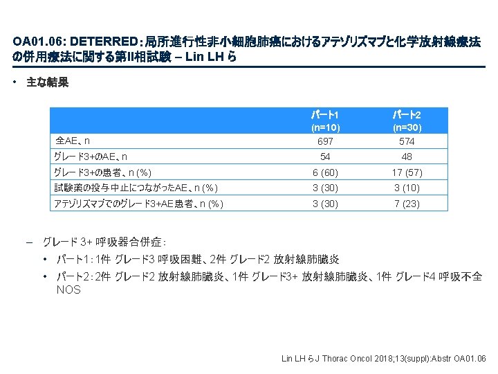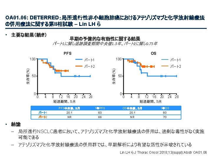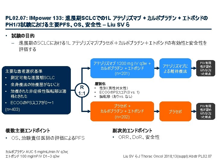 PL 02. 07: IMpower 133: 進展期SCLCでの 1 L アテゾリズマブ + カルボプラチン + エトポシドの PH 1/3試験における主要PFS、OS、安全性 – Liu SV ら • 主要な結果(続き) 治験責任医師の評価によるPFS 100 プラセボ + CP/ET (n=202) 189 (93. 6) PFS中央値、カ月(95%CI) 5. 2 (4. 4, 5. 6) 4. 3 (4. 2, 4. 5) HR (95%CI) 80 無増悪生存率、% PFSイベント、n(%) アテゾリズマブ + CP/ET (n=201) 171 (85. 1) 0. 77 (0. 62, 0. 96); p=0. 017 13. 9 追跡調査期間の中央値、カ月間 60 6カ月PFS 40 30. 9% 12カ月PFS 12. 6% 20 + 22. 4% アテゾリズマブ + CP/ET プラセボ + CP/ET 打ち切り時点 5. 4% 0 0 2 4 リスクに晒されて いた患者数 アテゾリズマブ 201 190 178 158 147 98 202 193 184 167 147 80 プラセボ 6 8 10 12 14 16 18 20 22 24 カ月 58 44 48 30 41 25 32 23 29 16 26 15 21 9 From NEJM, Horn L, et al. , First-line atezolizumab plus chemotherapy in extensive-stage small-cell lung cancer, DOI: 10. 1056/NEJMoa 1809064. Copyright © (2018) Massachusetts Medical Society. Reprinted with permission from Massachusetts Medical Society. 15 9 12 6 11 5 3 3 2 2 1 1 Liu SV ら J Thorac Oncol 2018; 13(suppl): Abstr PL 02. 07