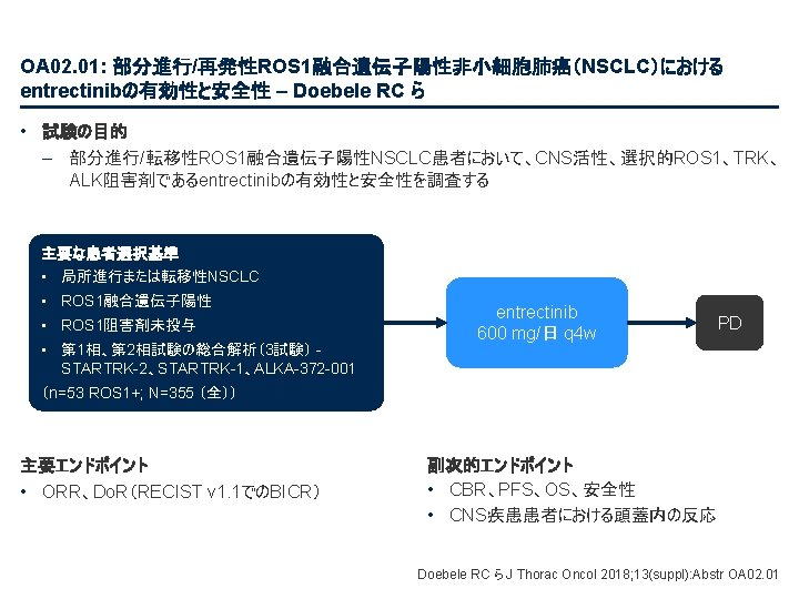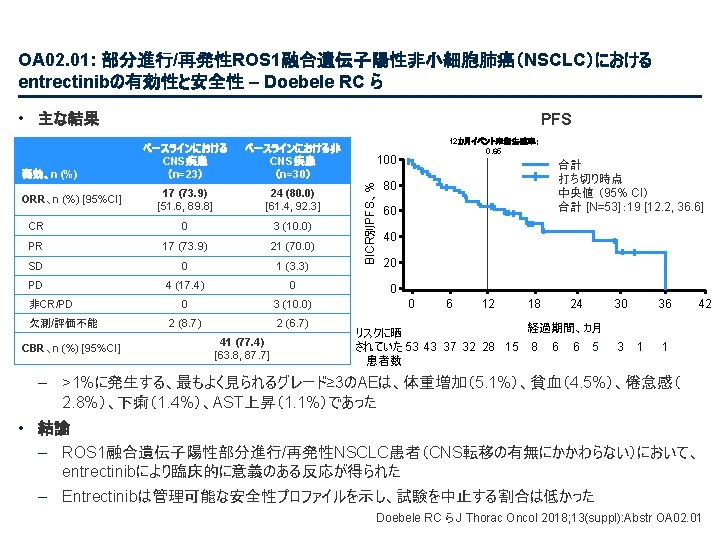 PL 02. 03: ALK阻害剤による治療歴のないALK+ NSCLC患者におけるブリガチニブとクリゾチニ ブの比較:第III相試験(ANTA-1 L)の第一次報告 – Camidge Rら • 主要な結果(続き) ベースラインにおいて何らかの脳転移があった患者における頭蓋内PFS 治療 ブリガチニブ クリゾチニブ 頭蓋内PFS、患者の割合(%) 100 頭蓋内PFS(中央値)、 カ月(95%CI) NR (11. 0, NR) 5. 6 (4. 1, 9. 2) 1年 PFS、% (95%CI) 67 (47, 80) 21 (6, 42) HR 0. 27 (95%CI 0. 13, 0. 54); ログランク検定 p<0. 0001 80 60 40 ブリガチニブ(n=43) 20 クリゾチニブ(n=47) 0 0 3 6 9 経過期間、カ月 From NEJM, Camidge R, et al. , Brigatinib versus Crizotinib in ALK-positive non–small-cell lung cancer, DOI: 10. 1056/NEJMoa 1810171. Copyright © (2018) Massachusetts Medical Society. Reprinted with permission from Massachusetts Medical Society. 12 15 18 Camidge R ら J Thorac Oncol 2018; 13(suppl): Abstr PL 02. 03