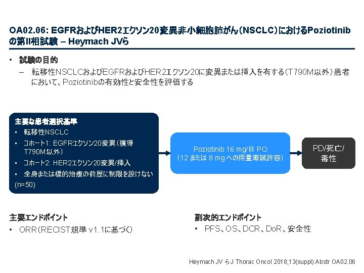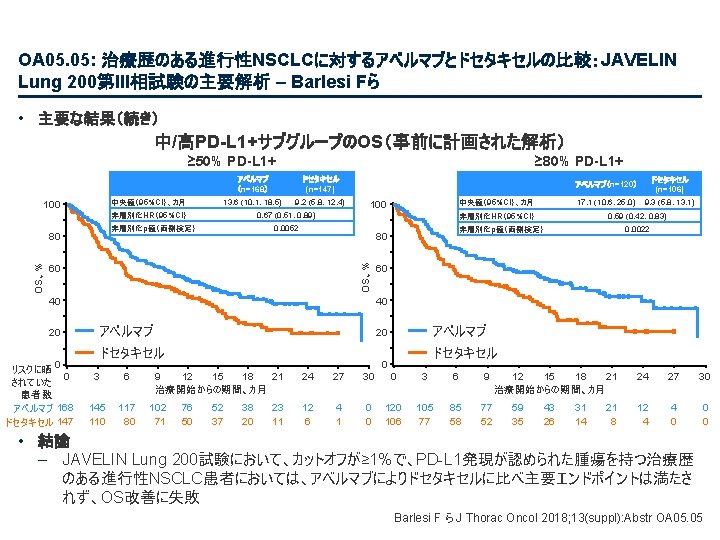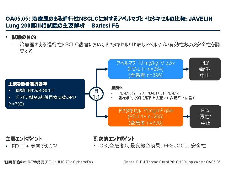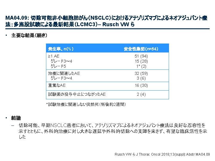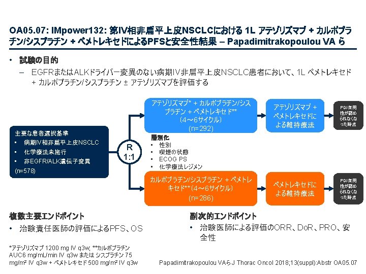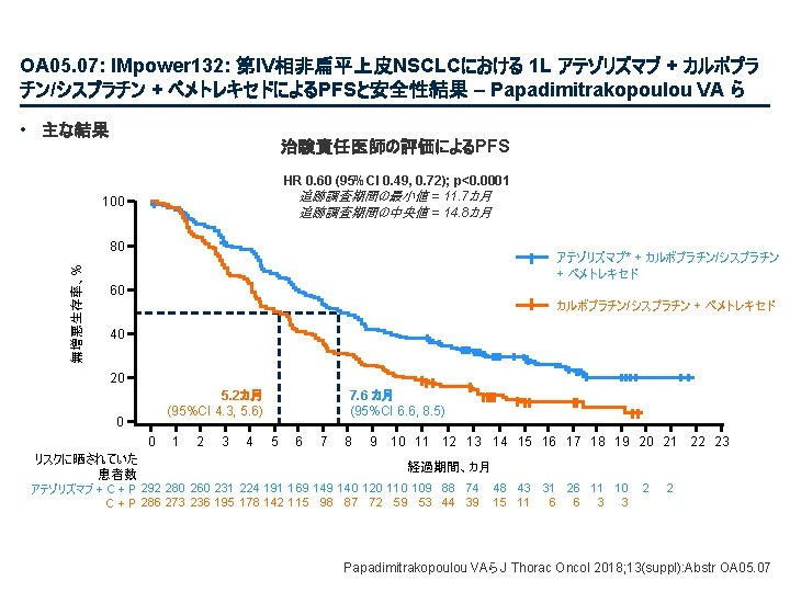 OA 05. 07: IMpower 132: 第IV相非扁平上皮NSCLCにおける 1 L アテゾリズマブ + カルボプラ チン/シスプラチン + ペメトレキセドによるPFSと安全性結果 – Papadimitrakopoulou VA ら • 主要な結果(続き) OS(中間解析) HR 0. 81 (95%CI 0. 64, 1. 03); p=0. 0797 最低限の追跡調査: 11. 7カ月 追跡調査期間の中央値: 14. 8カ月 100 全生存率、% 80 アテゾリズマブ* + カルボプラチン/シスプラチン + ペメトレキセド 60 40 20 13. 6カ月 (95%CI 11. 4, 15. 5) 0 0 1 リスクに晒されていた患者数 2 3 4 5 6 7 8 9 18. 1カ月 (95%CI 13. 0, NE) 10 11 12 13 14 15 16 17 18 19 20 21 22 23 経過期間、カ月 アテゾリズマブ + C + P 292 284 273 258 252 239 228 212 202 194 187 179 168 140 107 79 62 48 32 23 10 C + P 286 278 265 246 233 219 210 193 179 166 163 151 147 126 92 58 43 30 22 15 8 データ収集終了: 2018年 5月22日 7 4 1 2 1 Papadimitrakopoulou VAら J Thorac Oncol 2018; 13(suppl): Abstr OA 05. 07