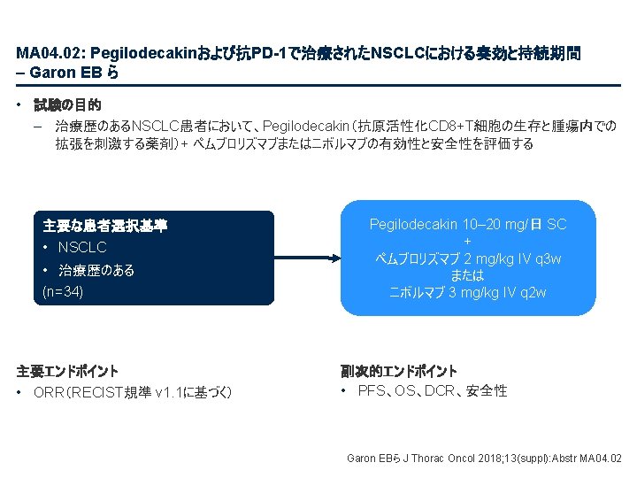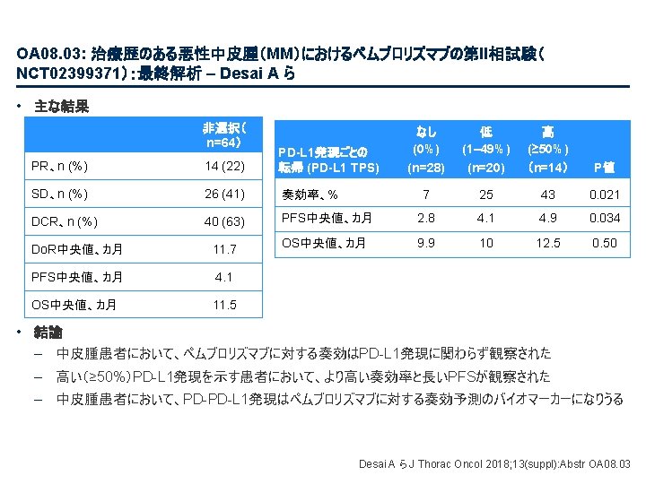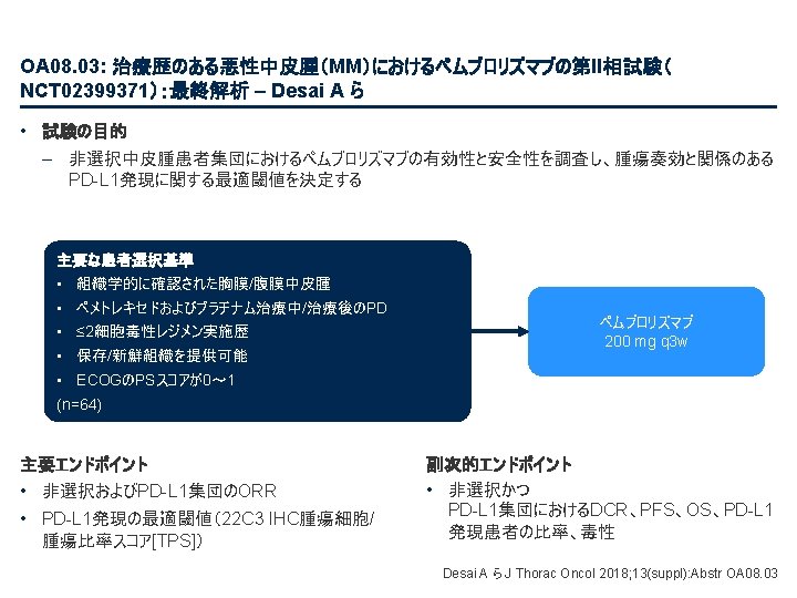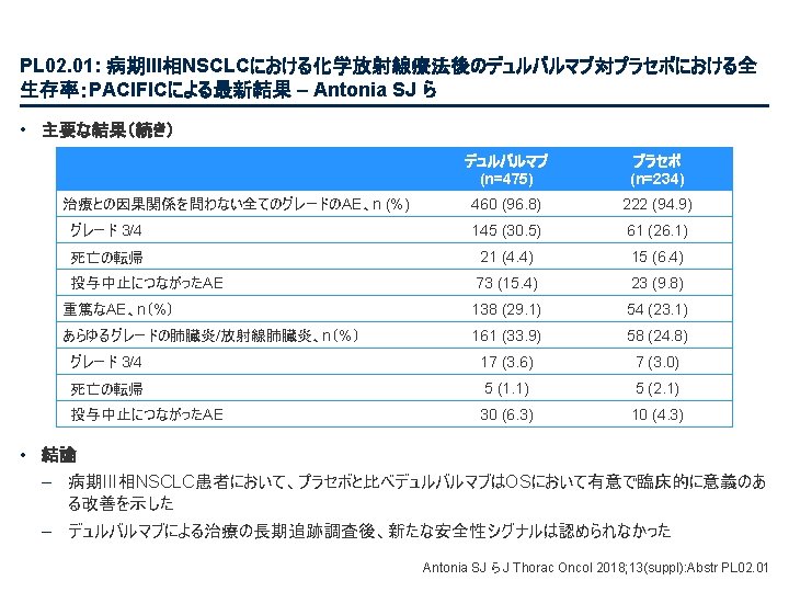 PL 02. 01: 病期III相NSCLCにおける化学放射線療法後のデュルバルマブ対プラセボにおける全 生存率:PACIFICによる最新結果 – Antonia SJ ら • 主要な結果(続き) 新規部位の発生率 BICRによる(ITT) 死亡またはBICRによる遠隔 転移に至る期間(TTDM)(ITT、最新情報) TTDM中央値、カ月 (95%CI) 死亡または遠隔転移の確率 1. 0 デュルバルマブ 28. 3 (24. 0, 34. 9) プラセボ 16. 2 (12. 5, 21. 1) 0. 8 TTDM HR 0. 53 (95%CI 0. 41, 0. 68) 0. 6 0. 4 0. 2 デュルバルマブ( n=476) プラセボ (n=237) いずれかの新規部位 107 (22. 5) 80 (33. 8) 肺 60 (12. 6) 44 (18. 6) リンパ節転移 31 (6. 5) 27 (11. 4) 脳 30 (6. 3) 28 (11. 8) 肝臓 9 (1. 9) 8 (3. 4) 骨 8 (1. 7) 7 (3. 0) 副腎 3 (0. 6) 5 (2. 1) その他 10 (2. 1) 5 (2. 1) 部位、n (%) 0. 0 0 3 6 9 12 15 18 21 24 27 リスクに晒されてい 無作為化からの経過期間、カ月 た患者数 デュルバルマブ 476 419 357 316 259 223 194 163 129 92 プラセボ 237 189 139 118 95 77 64 54 39 27 30 33 36 39 46 12 25 5 1 0 0 0 From NEJM, Antonia SJ, et al. , Overall survival with durvalumab after chemoradiotherapy in stage III NSCLC, DOI: 10. 1056/NEJMoa 1809697. Copyright © (2018) Massachusetts Medical Society. Reprinted with permission from Massachusetts Medical Society. Antonia SJ ら J Thorac Oncol 2018; 13(suppl): Abstr PL 02. 01