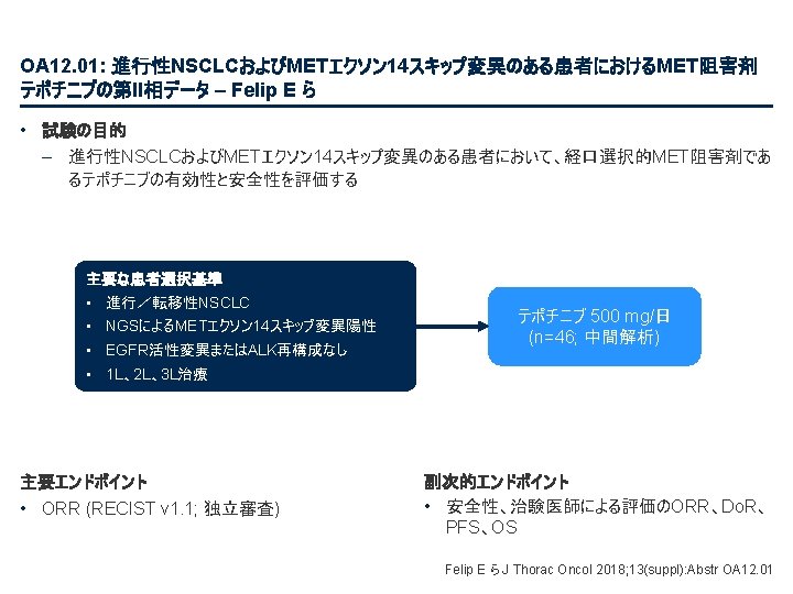 PL 02. 03: ALK阻害剤による治療歴のないALK+ NSCLC患者におけるブリガチニブとクリゾチニ ブの比較:第III相試験(ANTA-1 L)の第一次報告 – Camidge Rら • 主な結果 BIRC-評価による PFS 治療 PFS、患者の割合(%) 100 イベント発症患者、 PFS中央値、カ月( n(%) 95%CI) 1年PFS、% (95% CI) ブリガチニブ 36 (26) NR (NR, NR) 67 (56, 75) クリゾチニブ 63 (46) 9. 8 (9. 0, 12. 9) 43 (32, 53) 疾患進行または死亡のHR 0. 49 (95%CI 0. 33, 0. 74); ログランク検定によるp=0. 0007 80 60 40 ブリガチニブ(n=137) 20 クリゾチニブ(n=138) 0 0 3 6 9 経過期間、カ月 12 15 18 – 1年OS確率:ブリガチニブ 85%(95%CI 76, 91); クリゾチニブ 86% (95%CI 77, 91) From NEJM, Camidge R, et al. , Brigatinib versus Crizotinib in ALK-positive non–small-cell lung cancer, DOI: 10. 1056/NEJMoa 1810171. Copyright © (2018) Massachusetts Medical Society. Reprinted with permission from Massachusetts Medical Society. Camidge R ら J Thorac Oncol 2018; 13(suppl): Abstr PL 02. 03