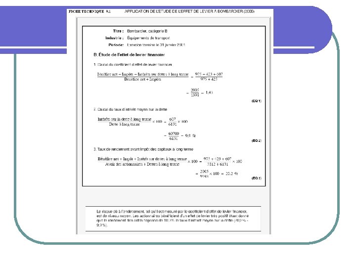 L’étude de l’effet de levier financier l L’analyse de l’effet de levier étudie de façon particulière la structure de capital et la rentabilité de l’entreprise afin de déterminer : l l si l’entreprise tire profit de son endettement, ou, autrement dit, si le rendement obtenu par l’entreprise à l’aide des sommes empruntées est supérieur au coût de cet argent (intérêt payé); l’importance du risque représenté par l’endettement pour les actionnaires.