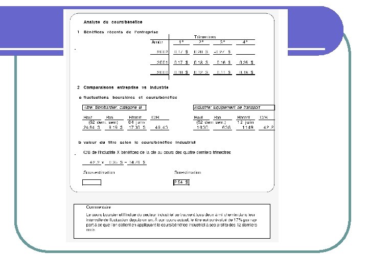 L’analyse du ratio cours/bénéfice Le rapport cours/bénéfice est l’un des ratios auquel l’investisseur boursier attache le plus d’importance parce qu’il permet de se représenter le prix d’un titre boursier non plus en matière de numéraire (ou en $) mais par rapport au bénéfice par action réalisé par l’entreprise au cours des douze derniers mois. l Par exemple, si la valeur au marché de l’action est de 10 $ et le bénéfice par action des 12 derniers mois, de 0, 75 $, on aura : l
