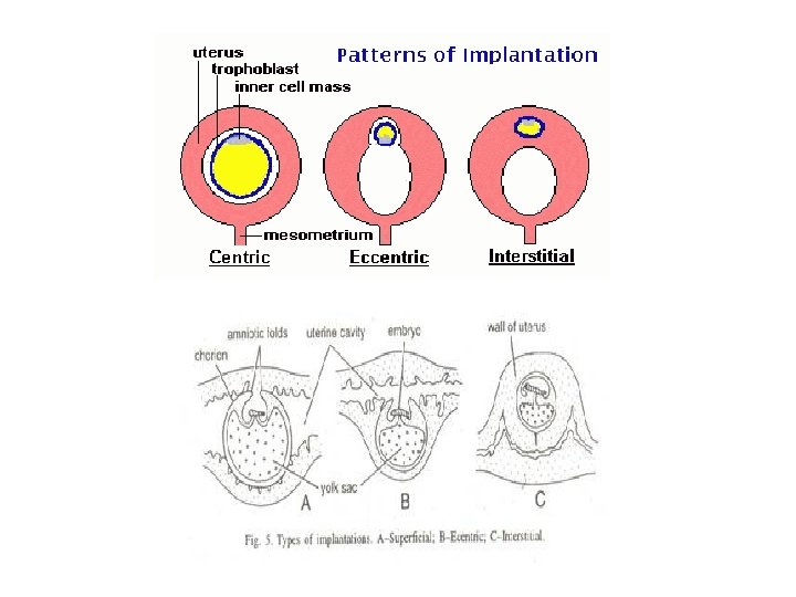 1)Central implantation: - embryo is attached to the surface of uterine lining and project freely into uterine cavity. also called superficial implantation ex- rabbit, carnivorous and lower chordates. . 2)Concentric implantation: - mucous lining of uterus giving out folds to cover the embryo which is embedded in a groove or pocket of main uterine cavity. Ex- mouse, rat, squirrel….