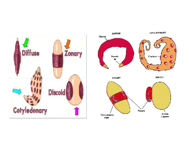 • Classification: based on distribution of villi on the surface of chorion A)Diffuse placenta: - uniformly distributed throughout the surface of blastocyst. Ex-pig , horse. . B)Cotyedonary placenta: - villi are arranged in groups, each group said to be cotyledon. Ex -sheep, cow, deer etc…. . c)Intermediate placenta: - blastocyst provided with both villi and cotyledon. The villi are distributed in between the cotyledon. ex- camel, giraffe……. d) Zonary placenta: -villi arranged in one or more girdles or circles around the blstocyst. Ex- elephant… e) Discoidal placenta: - villi are arranged in one or more disc shaped area. ex-rodents