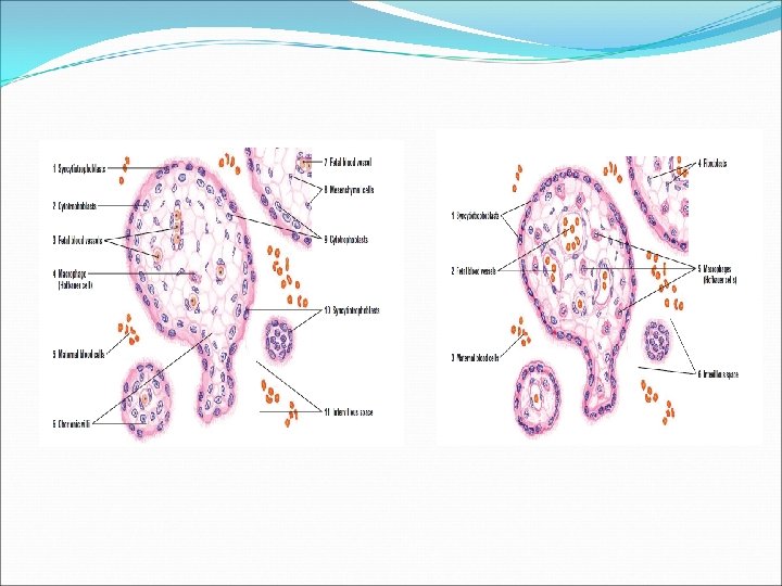 Placental barrier Early stage of pregnancy: 1. Endothelium of fetal blood vessels 2. Basement membrane of fetal blood vessels 3. Embryonic connective tissue 4. Basal lamina of cytotrophoblast 5. Cytotrophoblast 6. Syncytiotrophoblast.