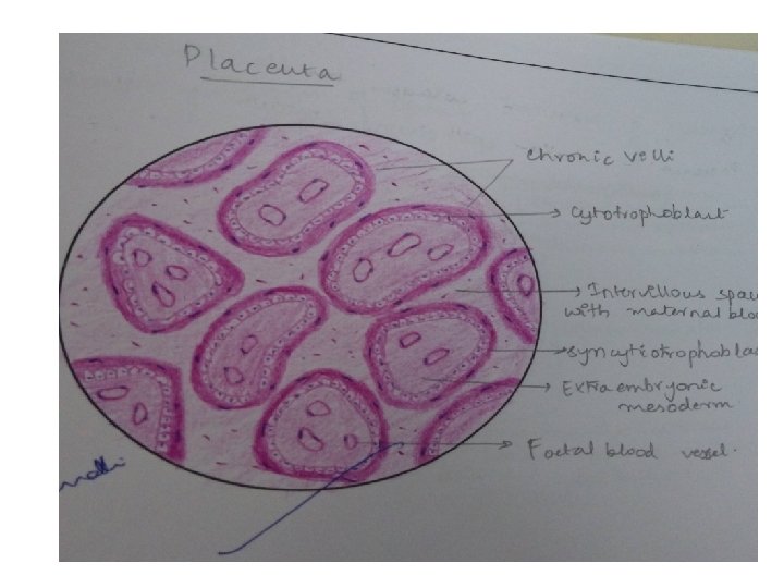 Identification points: 1. Cut section of villi’s with inner cytotrophoblast and outer syncytiotrophoblast layer. 2. Villi’s contains fetal blood vessels 3. Intervillous space has maternal blood.