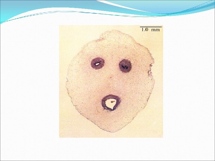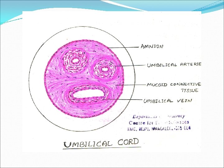 Identification points Presence of 2 umbilical arteries (medium sized artery) and one umbilical vein Presence of collagen fibres surrounding blood vessels and fibroblasts Layer of amnion which has simple sqamous epithelium.
