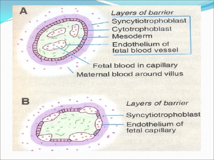 Layers of barrier in placenta nearing to term: 1. The endothelial cells of fetal blood vessels 2. Basement membrane of fetal blood vessels 3. Syncytiotrophoblast cells Thickness reduces from 0. 025 mm to 0. 002 mm