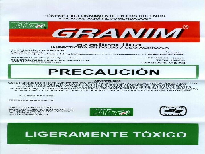 INGENIO AÑOS NOMBRE COMERCIAL NOMBRE COMUN DOSIS/ha GT Los Mochis 1981 NUVACRON DIPTEREX BAYTROID monocrotofós triclorfón cyflutrin 0. 750 -1500 ml/ 60 lt agua/ha FA-OM PIRT Plan Ayala 1981 NUVACRON DIPTEREX BAYTROID monocrotofós triclorfón cyflutrin 0. 750 -1500 ml/ 60 lt agua/ha FA-OM PIRT azinfós metílico CE 20 carbofurán CE 35 carbofurán G 5% endosulfán CE 35 monocrotofós LM 56 paratión metílico CE 50 3. 0 -3. 5 lt 2. 5 -3. 0 lt 15 -20 kg 2. 0 -3. 0 lt 1. 0 -1. 5 lt 1. 0 lt FH-SM CH-MM OC-Cd FA-OM FC-SM 1983