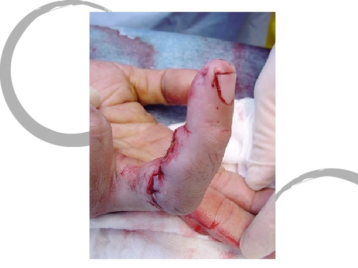 PHLEGMONS : • Infection qui se développe aux dépends d’une gaine d’un fléchisseur ou d’un espace de la main. • Signes cliniques : • Douleur : le long de la gaine. • Œdème, rougeur du doigt. • Doigt fixé en crochet, jusqu’à la rupture.