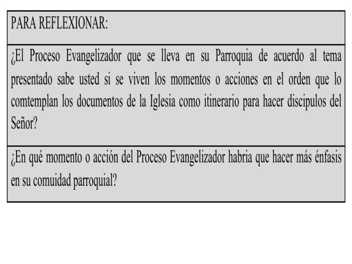 La Parroquia, comunidad de hombres y mujeres Se agrupan por lazos de fe Rasgos humano En un contexto de pluralidad, deben constituir no sólo en el plano espiritual - comunión eclesial-, sino también como comunidad humana La dimensión teoloógico - espiritual El Espíritu, que actúa en la comunidad la vivifica para crecimiento de su cuerpo Afloren valores y contravalores respecto a las relaciones personales Lo ideal es que se estructure en pequeñas comunidades, facilitando la intercomunicacio n de sus miembros El revitalizar la parroquia tiene como finalidad hacer de ella una “familia” en la que las relaciones interpersonales, fundamentadas en la fe, cristalicen en actitudes de fraternidad, de respeto a la diversidad, de acogida a los alejados, de compartir los gozos y las penas del grupo