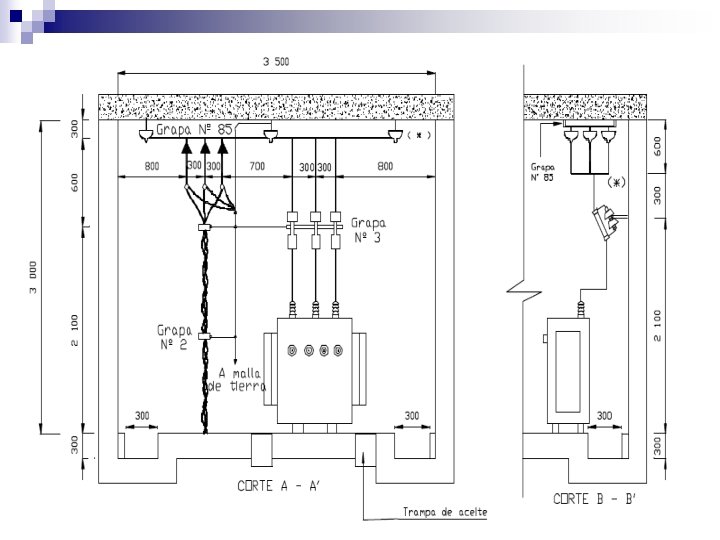 Plan de Seguridad de Bienes Requerimientos Técnicos y Especificaciones Normativas para el diseño estructural y eléctrico de la Bóveda. Objetivo. - Brindar la mayor seguridad al patrimonio inmerso en el diseño de la bóveda, así como a todo su e § Ubicación: La bóveda de transformación se localizará preferiblemente en un sitio donde sea posible la llegada del montacargas hasta su puerta de acceso. En ningún caso la ruta de entrada y salida de equipos será a lo largo de escalas o espacios que impidan el arrastre o el uso de instrumentos de maniobra. De acuerdo a la norma NATSIM 14. 2 el cuarto de transformadores será ubicado a nivel de la planta baja del inmueble. § Dimensiones y especificaciones de construcción: El Cuarto de Transformadores albergará 3 transformadores monofásicos de 75 k. VA cada uno, y sus dimensiones serán: Alto: 2. 5 m Ancho: 3 m Largo: 3. 5 m