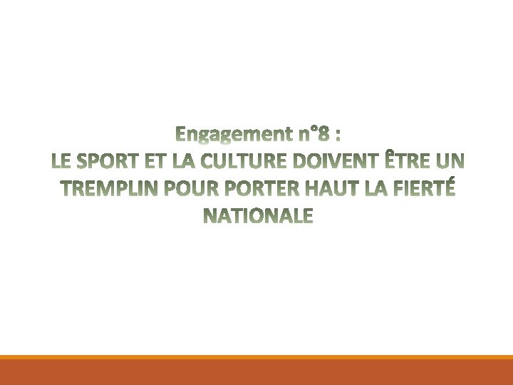 PRIORITE 17 – Promouvoir l’accès au sport et l’épanouissement de la jeunesse Défis à relever: § Bâtir une Grande Nation Sportive apte à concourir et à remporter des compétitions régionales, continentales et mondiales, à travers une nouvelle dimension du secteur SPORT et des nouvelles bases Objectifs sectoriels: § § § Développer le sport, et le sport de haut niveau ciblé avec des bourses sportives Disposer en provinces d’infrastructures conformes aux standards internationaux Faire émerger des citoyens en bonne santé, actifs, compétents en conformité avec le Plan d'Action de Kazan et le Plan d'action Mondial 2018 -2030 pour l'activité physique au service de la santé. Réformes: § § Conclusion d’une convention de bonne gouvernance, d'éthique et de développement entre le MJS et le Comité Olympique Adoption d’une nouvelle Politique Nationale des Sports, en conformité avec l'Agenda Olympique 2020, la Charte internationale révisée de l'éducation physique, et le Plan d'Action de Kazan Mise en œuvre des stratégies fédérales sur l'éthique, l'intégrité et la lutte contre le dopage Adoption d'un nouveau Décret portant Statut et préparation continue des athlètes de haut niveau. Actions prioritaires: § § § Elargir et moderniser le stade de Mahamasina aux normes internationales, avec une capacité de plus de 50. 000 personnes Construire et doter en équipements les Grandes Académies Nationales des Sports ainsi que des académies des Sports respectant les normes internationales dans des chefs-lieux de province Doter chaque fédération des équipements sportifs adéquats et aux normes ;