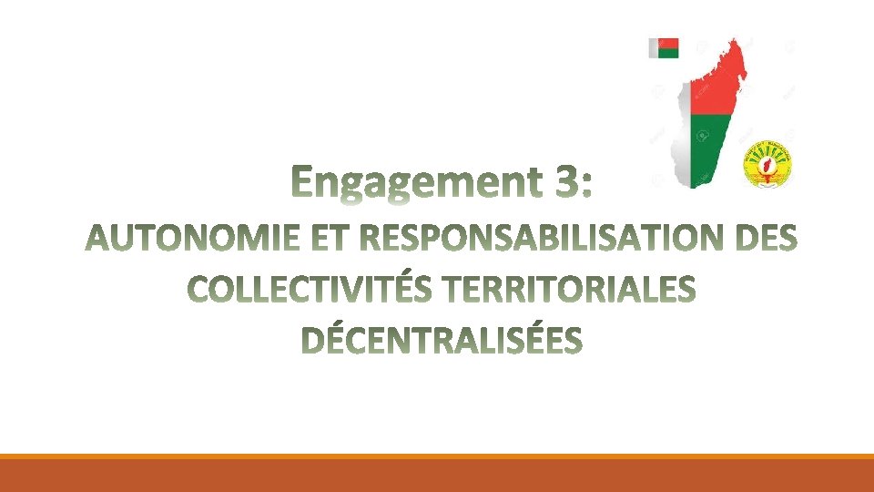 PRIORITE 8 - Gouvernance foncière et territoriale : structurer Madagascar et faciliter le développement rural Défis à relever: § Sécurisation du peuple vis-à-vis de ses propriétés foncières; § Multiplication des Guichets Fonciers (GF) sur l’ensemble du territoire national § Elaboration des Plans Local d’Occupation Foncière; § Mise en place de Schéma Régional de l’Aménagement du Territoire (SRAT) à jour dans toutes les régions d’ici 2023 et des Plans Régionaux de Développement des Infrastructures et Équipements (PRDIE) ØRéformes: Objectifs sectoriels: v Reconnaitre la diversité des situations foncières et offrir à tous la possibilité de protéger légalement leurs droits à moindre coût ; v Satisfaire les besoins en terres pour les investissements publics et les activités socioéconomiques dans une perspective de maintien des services environnementaux ; v Améliorer la gestion foncière en coordonnant de façon plus efficace les interventions des acteurs ; v Mettre en œuvre les orientations et axes de la Nouvelle Lettre de Politique Foncière ; v Valoriser les zones à hautes potentialités ; v Renforcer la planification, l’organisation et la structuration du territoire ; v Promouvoir la mise en valeur des territoires, des équipements et de l’habitat Ø Dématérialisation des services fonciers ; Ø Promotion de sécurisation foncière massive ; Ø Restructuration des guichets uniques et services fonciers existants ; Ø Constitution de « Réserves foncières spécifiques » destinées à l’appui aux CTD ou aux secteurs : ZIA, ZIT, ZRS ; Ø Acquisition d’image satellitaire de couverture nationale Ø Mise en place d’un cadre juridique de l’Émergence à travers une réforme des lois et des cadres juridiques sectoriels ; Ø Mise en place de 12 Pôles de croissance et de 107 Espaces de Solidarité pour harmoniser l’équilibre territorial ; Ø Création des Agences et services d’appui, transferts de compétence et ressources aux 12/107 Espaces de solidarités à savoir : le Centre de Formation Technique (CFT), le Centre de Promotion des Femmes et Jeunesse (CPFJ), l’Agence Nationale pour l’Emploi (ANE), le Centre d’Appui Financier (CAF) et le Centre Appui à l’Environnement et au Développement Durable (CGAEDD), etc. Ø Amélioration de l’octroi des fonds du Fonds de Développement Local (FDL) aux Communes, Actions prioritaires: Governance Foncière: ü Renforcer la sécurisation foncière et préserver les capitaux fonciers de l’Etat ; ü Faciliter l’accès au foncier au profit des personnes en milieu rural ; ü Renforcer la valeur légale des titres et des certificats fonciers ; ü Etablir les Plans Local d’Occupation Foncière PLOF sur tout le territoire ; ü Appuyer toutes les communes dans la mise en place des Guichets Fonciers : mise à jour des propriétés foncières des communes, étude de faisabilité des emplacements des nouveaux Guichets fonciers (GF), élaboration des Plans Local d’Occupation Foncière (PLOF) des communes ; ü Gouvernance territoriale : ü Mettre en place la 23ème Région (Vatovavy) ; ü Développer des outils de planification territoriale tels que le Schéma National de l’Aménagement du Territoire (SNAT), la Politique Nationale de Développement des Infrastructures et Équipements (PNDIE), la Politique Nationale de Logement (PNL). ü Mettre en œuvre la Structuration territoriale de l’émergence